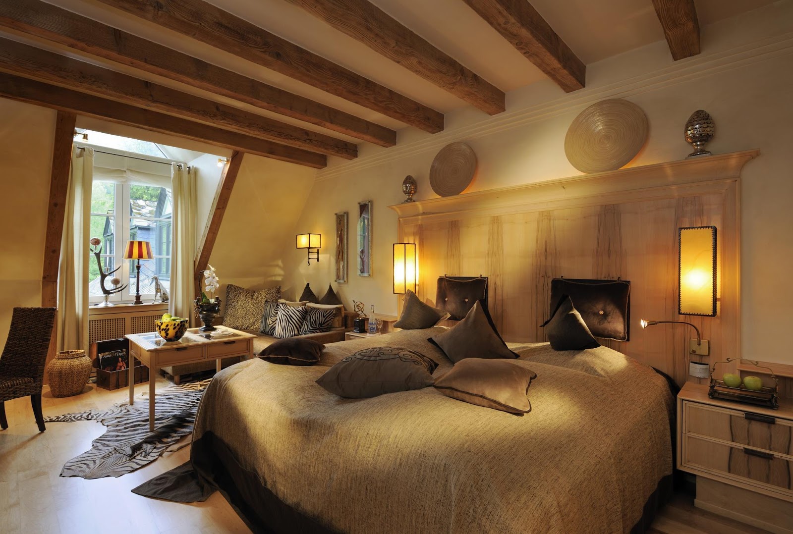 Особое внимание нужно уделить полу. Для интерьера в африканском стиле характерны каменные полы, которые в условиях нашей страны могут быть не очень практичны. Но чтобы напольное покрытие сочеталось с остальным оформлением помещения, вы можете уложить на пол паркетную доску, главное не использовать гладкий и красивый ламинат. Полы должны выглядеть грубо и натурально. В интерьере так же замечательно будет выглядеть как на стенах так и на полу бамбук. Не стоит забывать и про потолок, отлично будут смотреться балки из темного дерева, оформленные бамбуковыми стеблями.